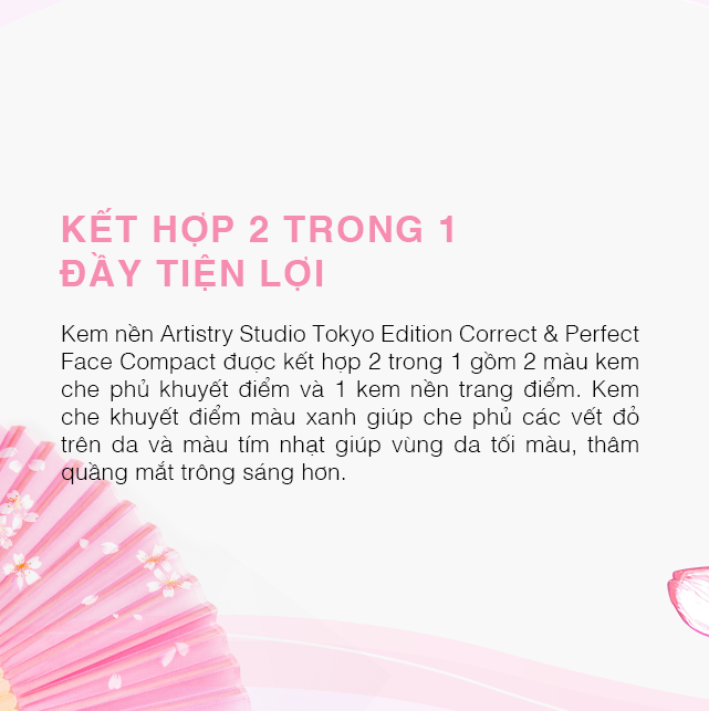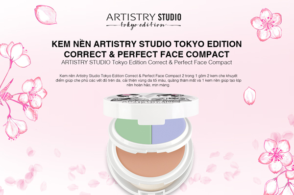 Kem nền Artistry Studio Tokyo Edition Correct & Perfect Face Compact kết hợp 2 trong 1 gồm kem nền trang điểm và 2 kem che phủ khuyết điểm. Kem che khuyết điểm màu xanh giúp làm che phủ các vết đỏ trên da. Kem che khuyết điểm màu còn lại giúp vùng da tối màu, thâm quầng mắt trông sáng hơn. Sau khi che khuyết điểm, sử dụng kem nền trang điểm để tạo